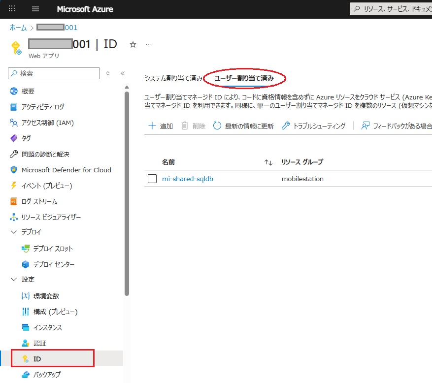 ③Azure Appで、「ID」をオンにして、「ユーザー割り当て済み」に追加。なんで「マネージド ID」と表示されていないのか?と疑問に思いますが・・・。